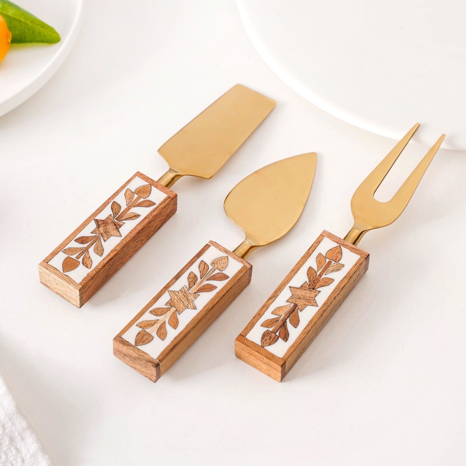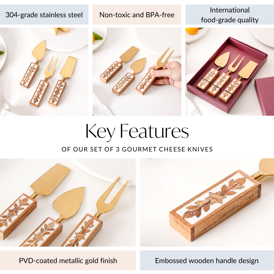 Transform your cheese platter into a culinary masterpiece with our exquisite set of 3 cheese knives. Made from high-quality 304-grade stainless steel, these knives guarantee both strength and safety, being non-toxic and BPA-free. Ensuring international food-grade standards, each knife boasts a PVD-coated metallic gold finish, radiating opulence on your dining table. Included is a parmesan knife tailored for hard cheeses, a versatile spade for effortless slicing, and a flat knife ideal for spreading soft cheeses. Complementing their functionality, the cheese knives feature intricately embossed wooden handles, marrying comfort with elegance for a truly indulgent cheese experience. The products come neatly packed in a gift box.