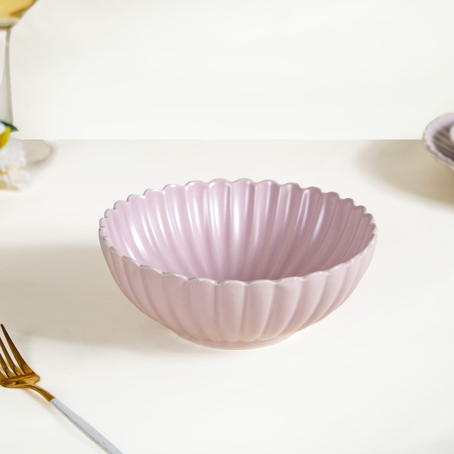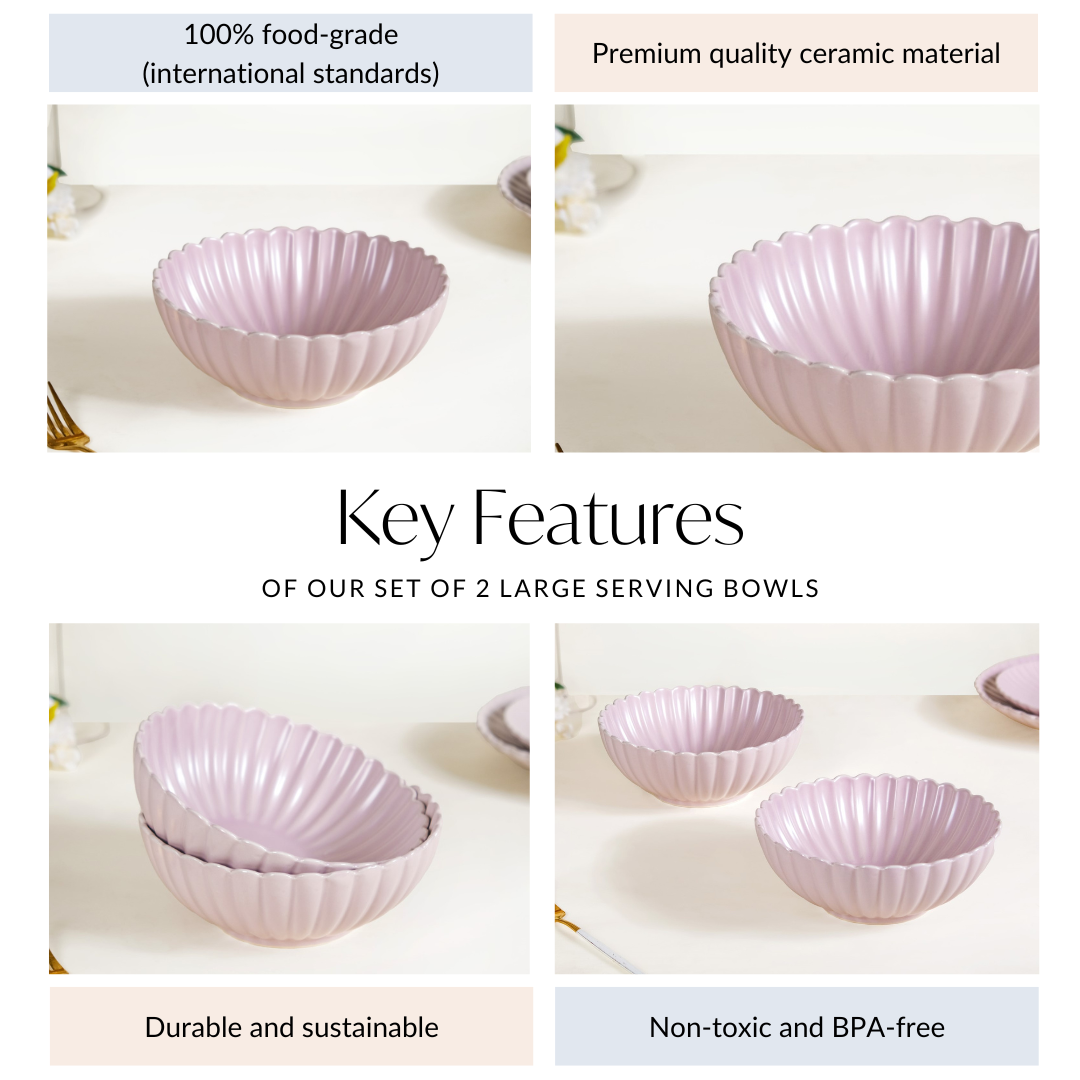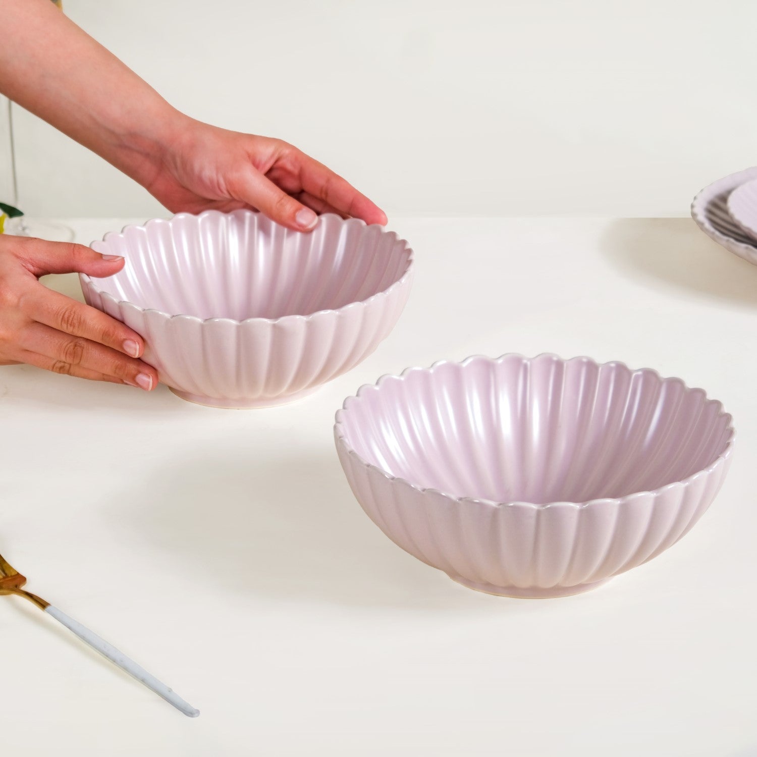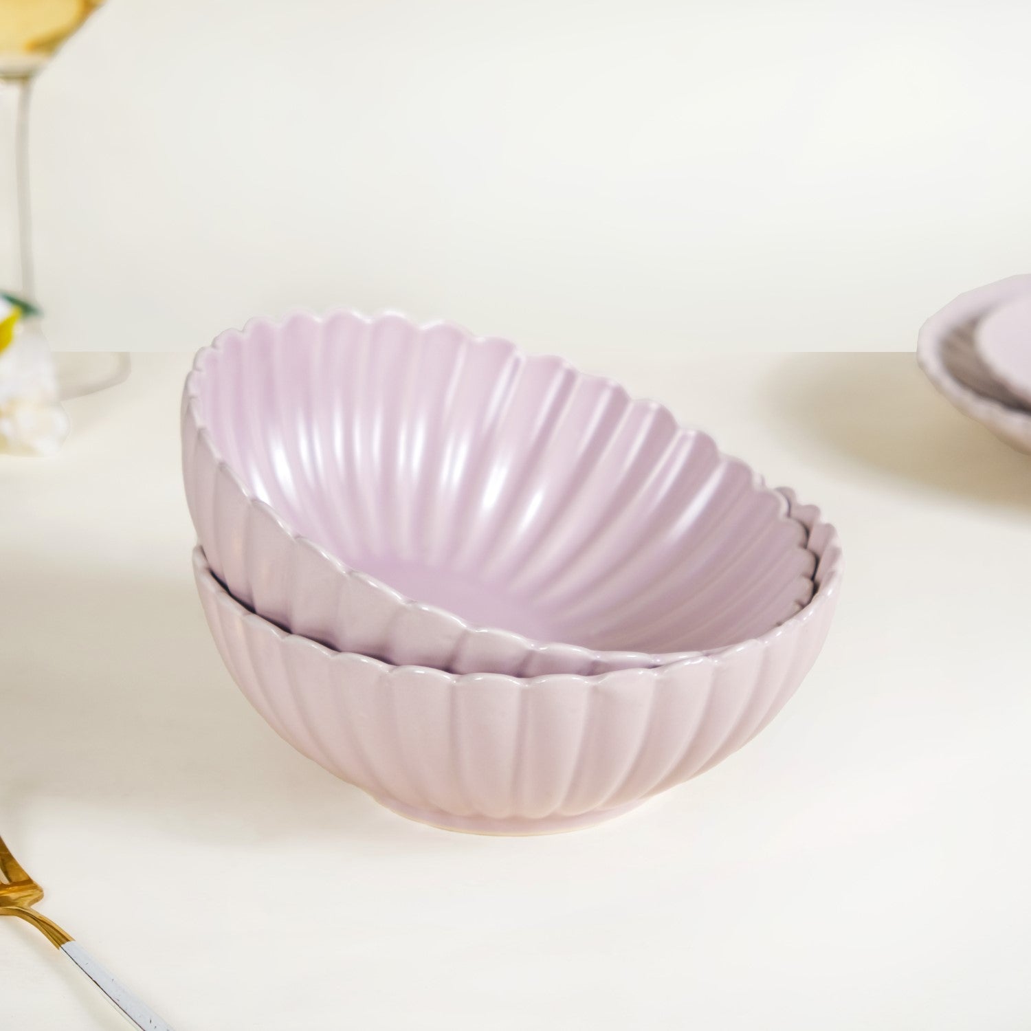 Add some magic to your tablescape with our alluring lilac-hued ceramic bowls. Crafted from premium-quality odourless ceramic material, the set of 2 serving bowls has been expertly fashioned in intriguing clam shapes that create visual interest. The non-toxic and BPA-free construction assures high standards of food safety, putting your mind at ease. No need to reach out for extra dishes as the microwave-friendly design allows you to heat tasty dishes before serving. Apart from the convenient dishwasher-safe construction, the hand-glazed surface makes these ceramic serving bowls durable and easy to clean.
