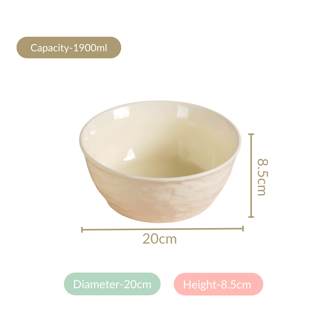 Indulge in the epitome of culinary refinement with our distinguished serving bowls, meticulously curated to enhance your dining experience with unparalleled sophistication. Crafted from non-porous ceramic, these bowls epitomise durability and elegance, embodying the perfect harmony of form and function. Stackable for seamless storage and dishwasher-safe for effortless maintenance, they effortlessly blend practicality with luxury. Their microwave-proof design ensures that your culinary creations are served as if fresh off the stove, while their resilient nature makes them impervious to stains and chips. Adorned with a mesmerising textured pebble design and meticulously hand-glazed surface, each bowl is a testament to the artistry of fine craftsmanship. Sourced ethically and crafted sustainably, they reflect our unwavering commitment to both quality and environmental responsibility. Whether serving fragrant rice, comforting dal, savoury curries, or delectable pasta dishes, these versatile bowls are the epitome of culinary versatility, promising to elevate every mealtime occasion with unparalleled elegance.