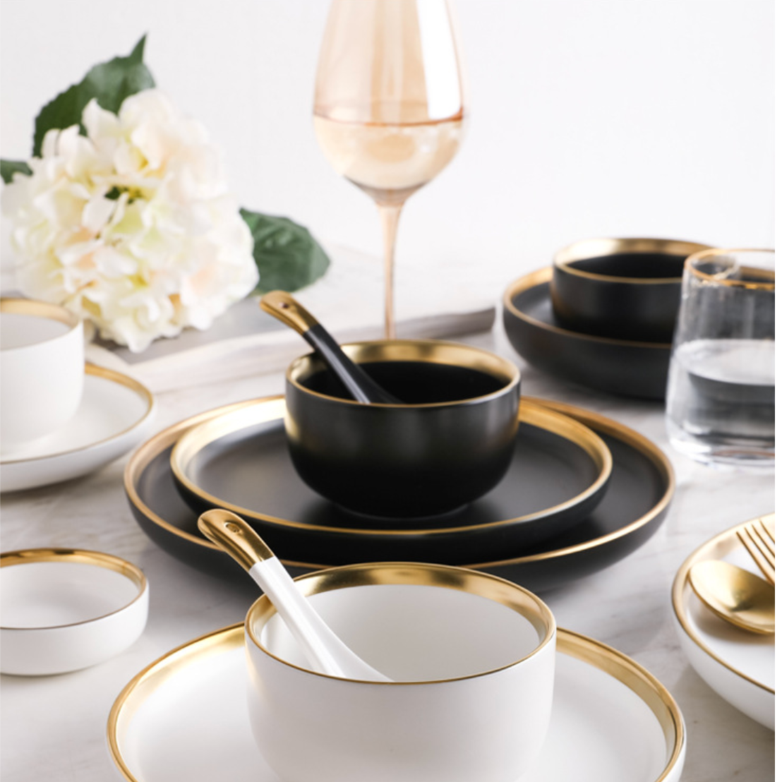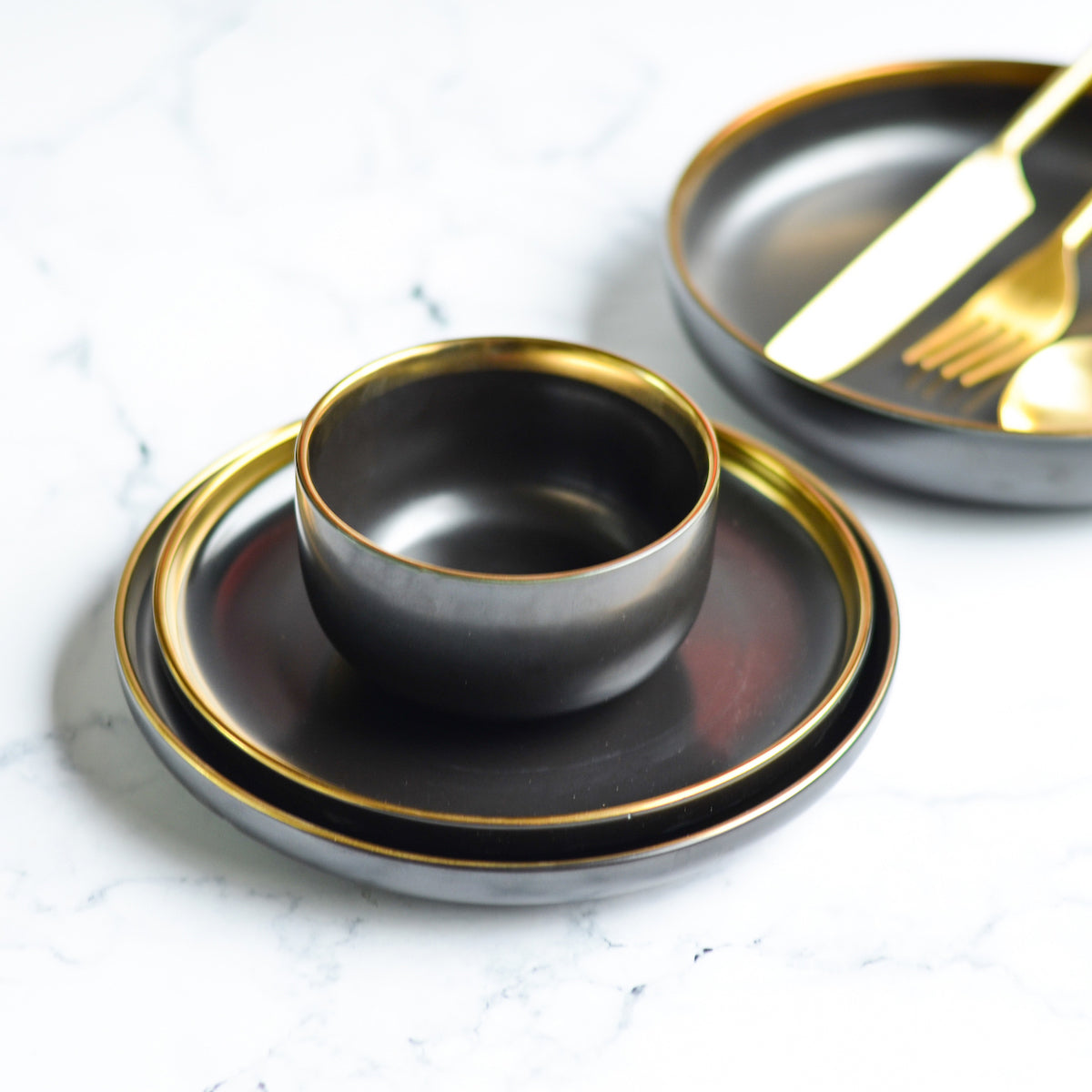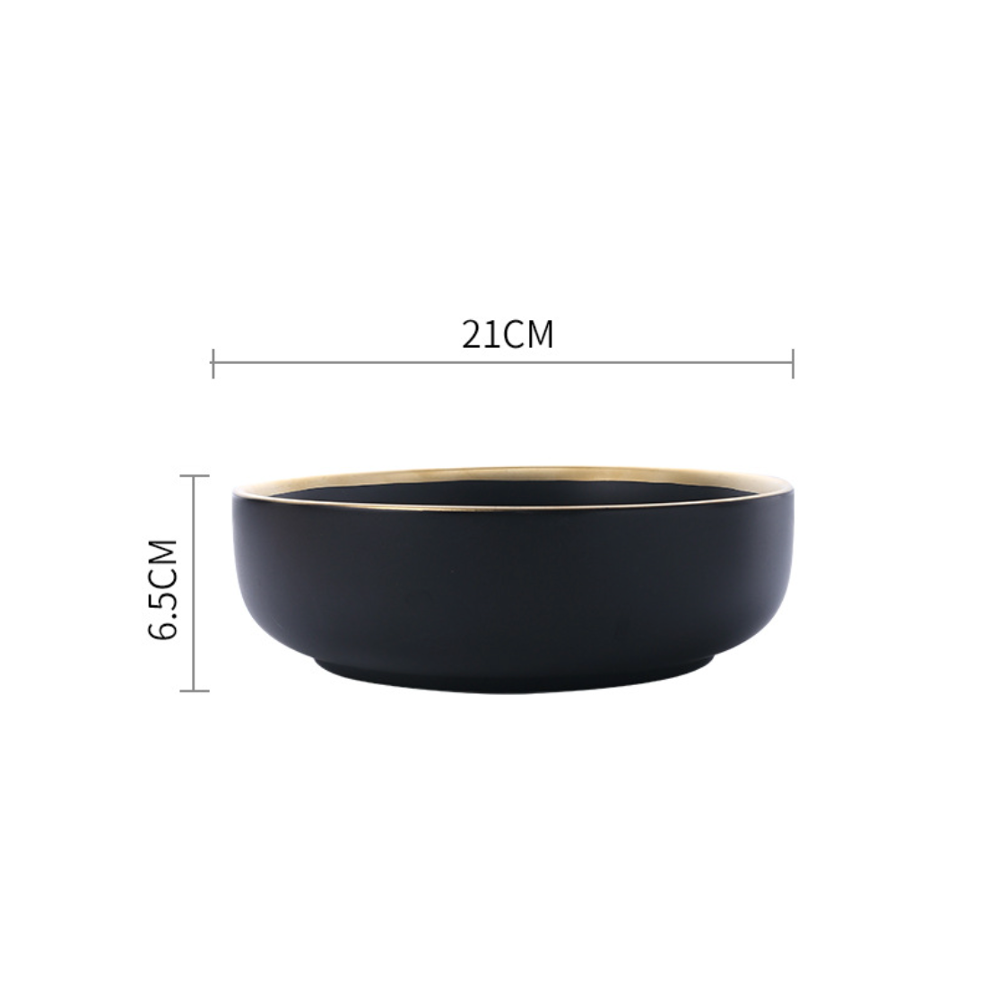 The serving bowl and side bowl from the Vera collection feature a matte black colour that beautifully complements the stunning golden rim. Crafted of high-quality ceramic the classic form of the bowl elevate the dining experience with its functionality. The side bowl is ideal for serving side curries and vegetables, or for serving fritters & fries during gatherings. The serving bowl can be used for serving meals like gravies, rice, and other dishes during lunch or dinner.