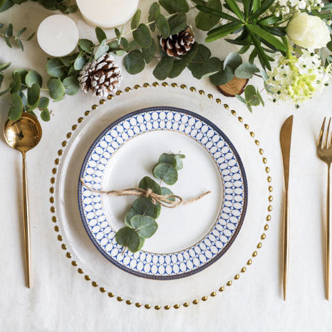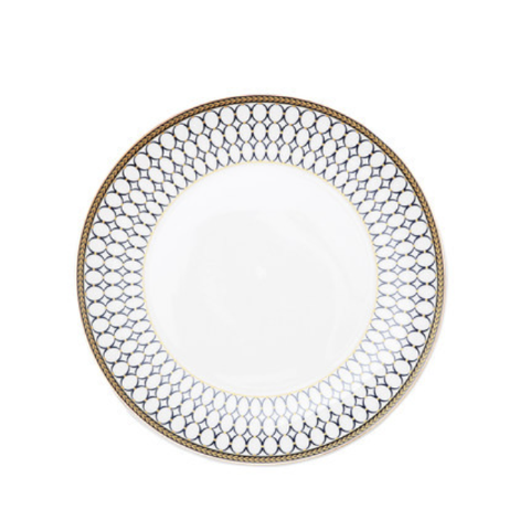 A side plate with a patterned blue rim is just the kind of crockery one needs to add sophistication and elegance to the dinner table. The ceramic appetizer dish and dinner plate may be used to serve bread with vegetables, sauce, and curry. The side dish may function as both a snack plate and a fruit plate. Before the main course, the side dish can also be used to serve bread buns and soup.
