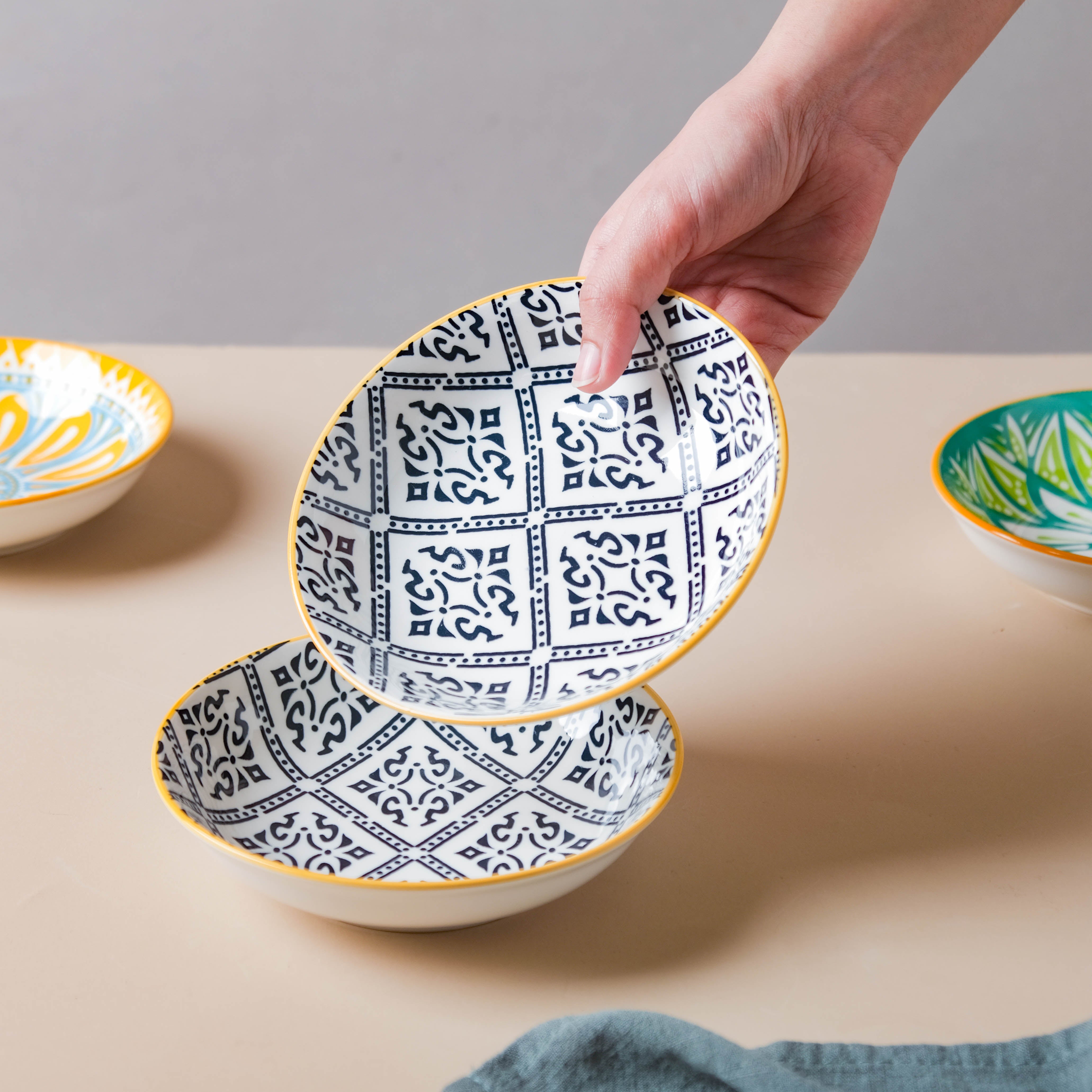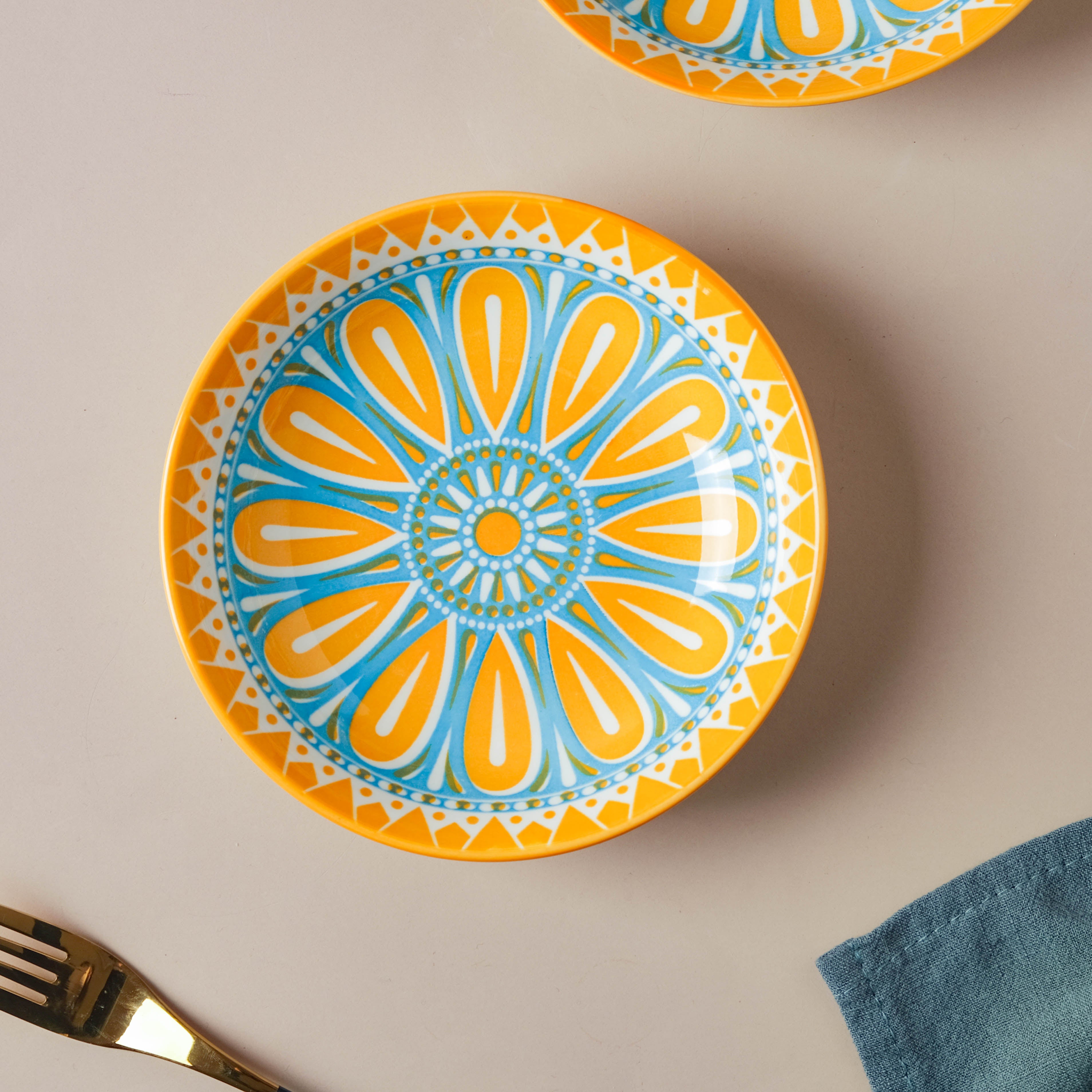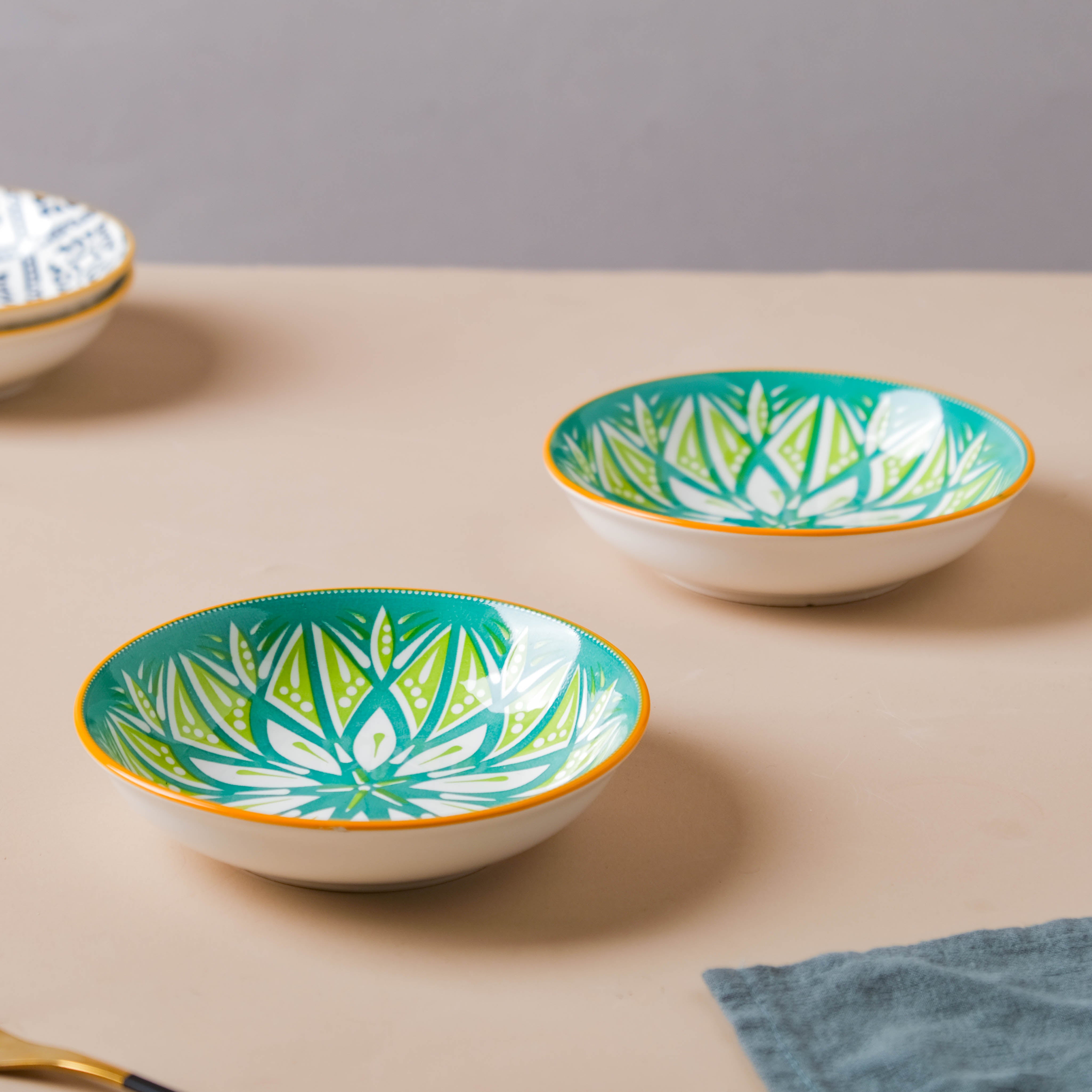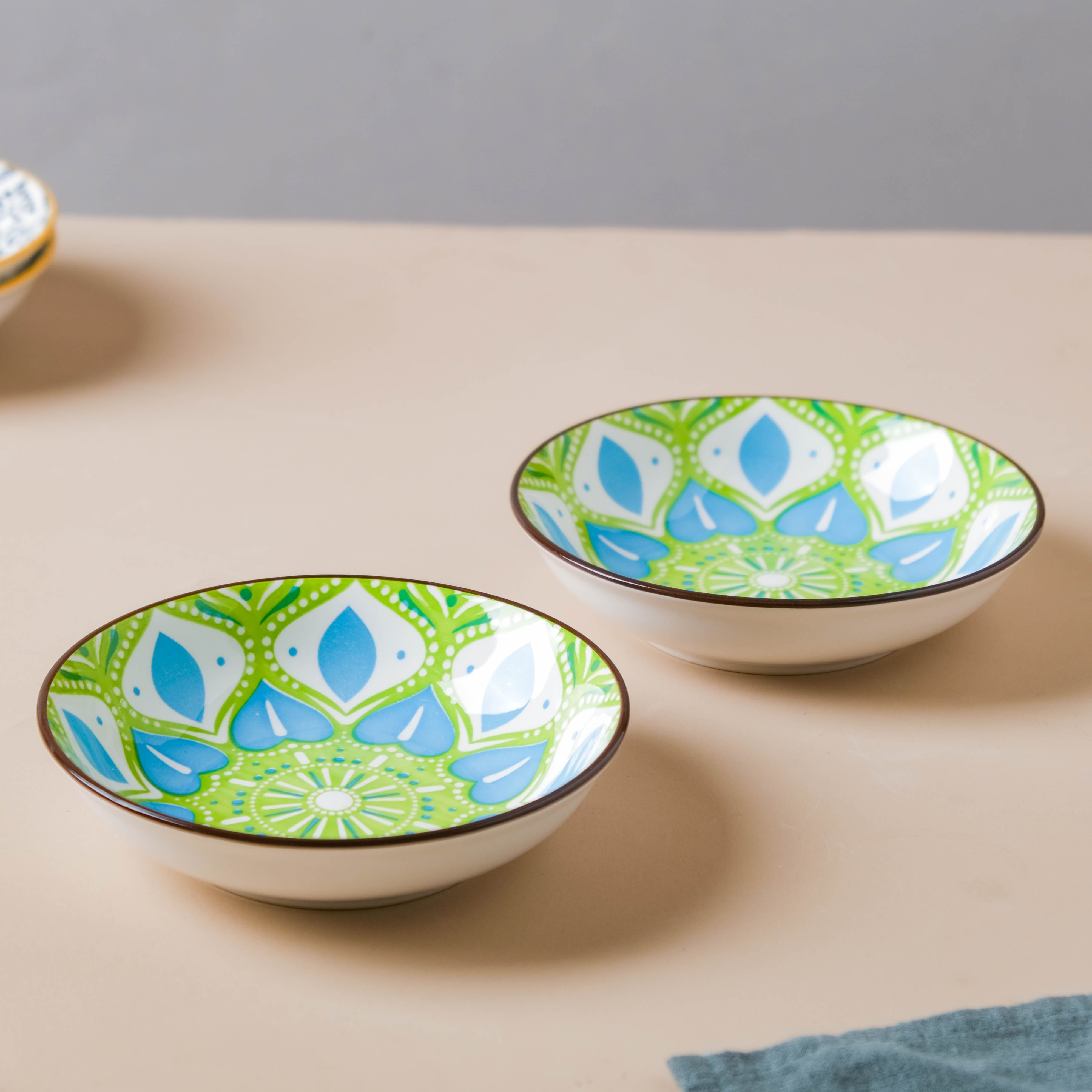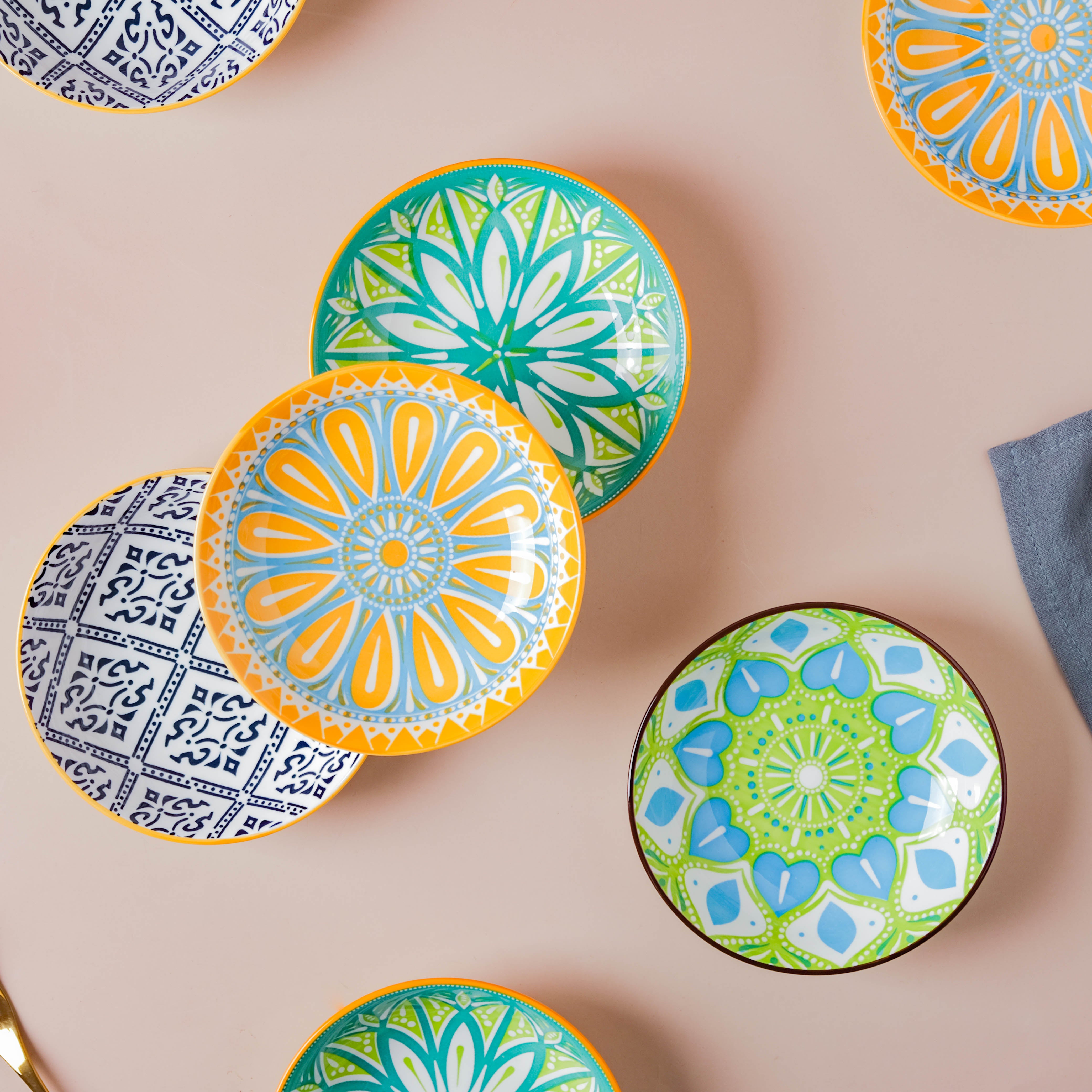 Two little plates with unique patterns engraved on them make up the mandala appetizer plate set. The plates are available in four bright colours. The patterned ceramic plate adds a quirky touch to the dinner table or kitchen shelf. The printed plates can be used as snack plates, appetizer plates, dessert platters, or salad plates.