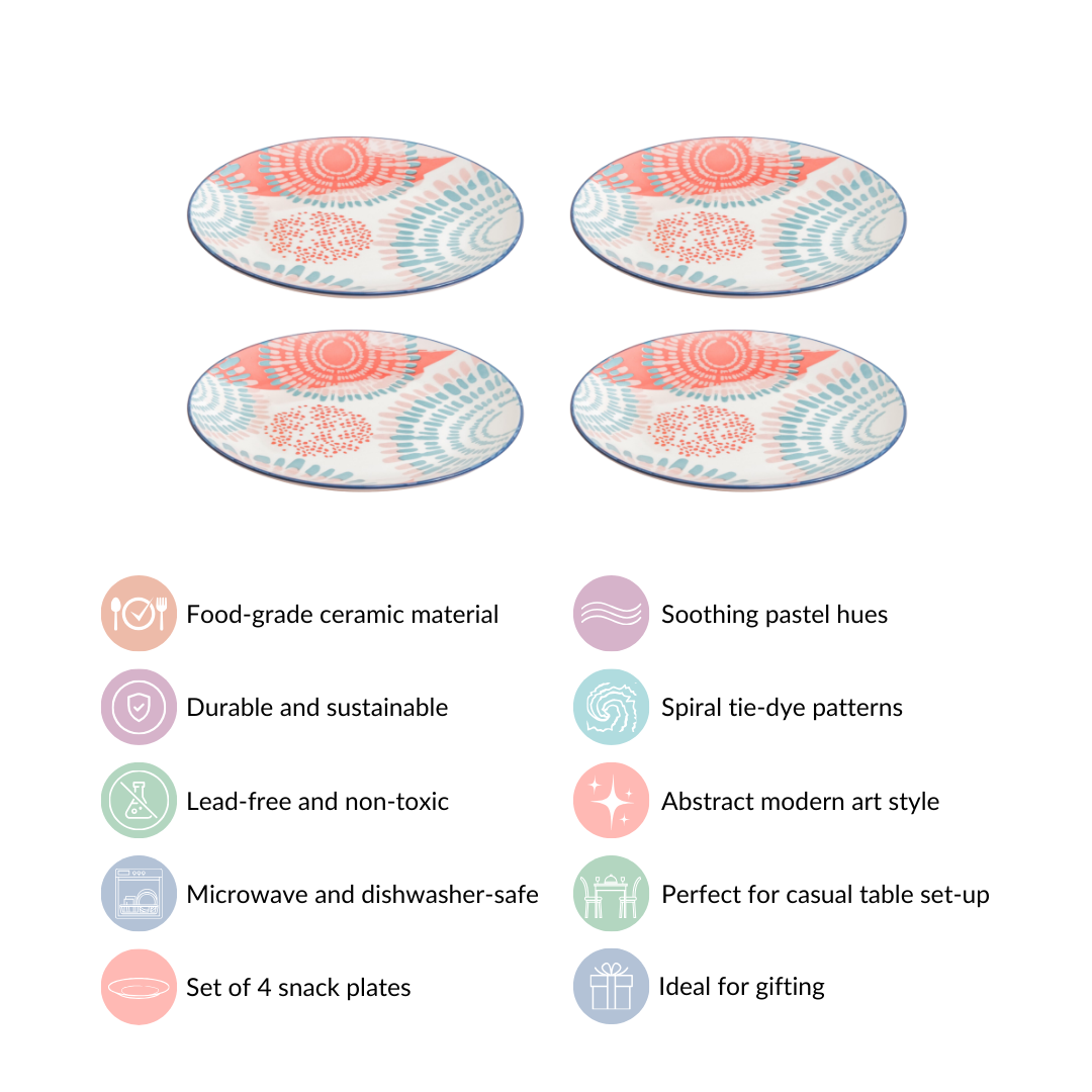 Experience snacking in style with our exquisite set of 4 ceramic snack plates, where functionality meets captivating design. Crafted from food-grade ceramic, these ceramic plates guarantee durability and sustainability, ensuring a safe snacking experience. Unlike ordinary plates, ours boast unique spiral tie-dye patterns in soothing pastel hues, embodying an abstract modern art style that's sure to impress. Perfect for adding a touch of elegance to any table setting, these appetiser plates elevate your snacking affair. Microwave and dishwasher-safe for convenience, they're not just practical but also visually striking. Treat yourself or gift your loved ones with these chic and charming snack plates today!