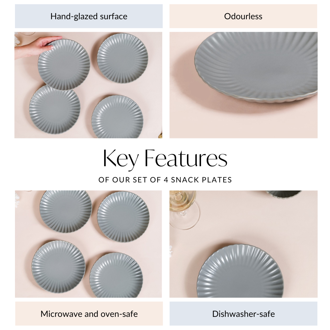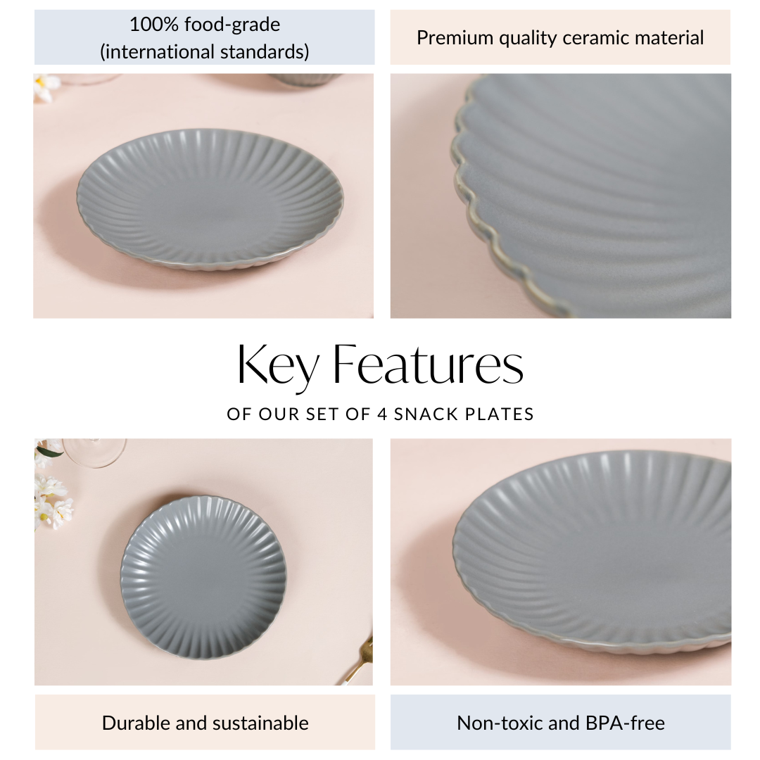 Snack in style with our solid grey ceramic snack plates. Designed from premium-quality non-porous ceramic, the plates offer plenty of room for delightful snacks. Whether you're craving some savoury bites or indulging in decadent sweet treats, the eye-catching scallop shape adds an element of intrigue to your snack time. The microwave-friendly design allows you to quickly reheat your leftover snacks, if any. The non-toxic and BPA-free construction upholds the ultimate standards of food safety, prioritising your well-being. Completely dishwasher-safe, the ceramic plates take little to no effort to clean. The hand-glazed surface further serves as a protective layer, rendering the non-toxic and BPA-free plates durable and long-lasting.