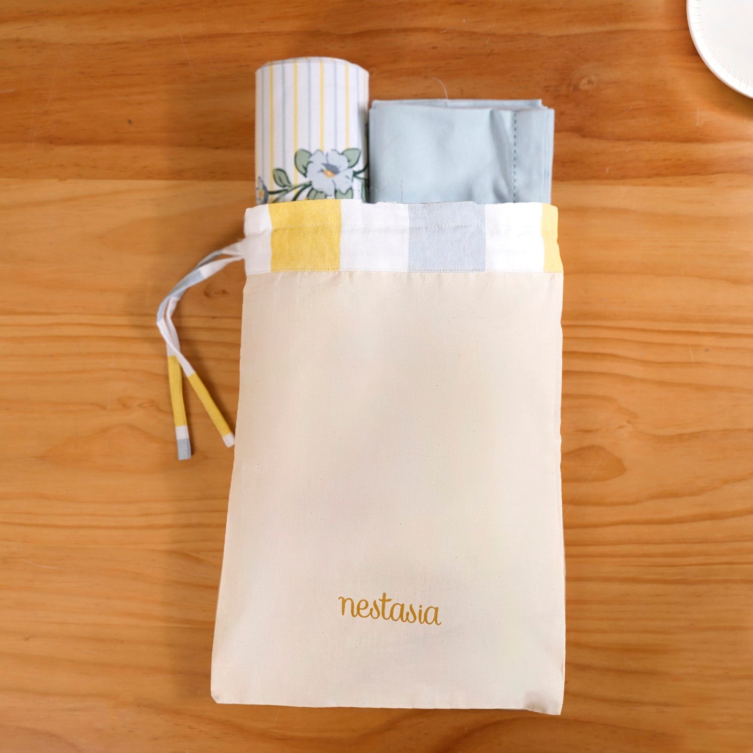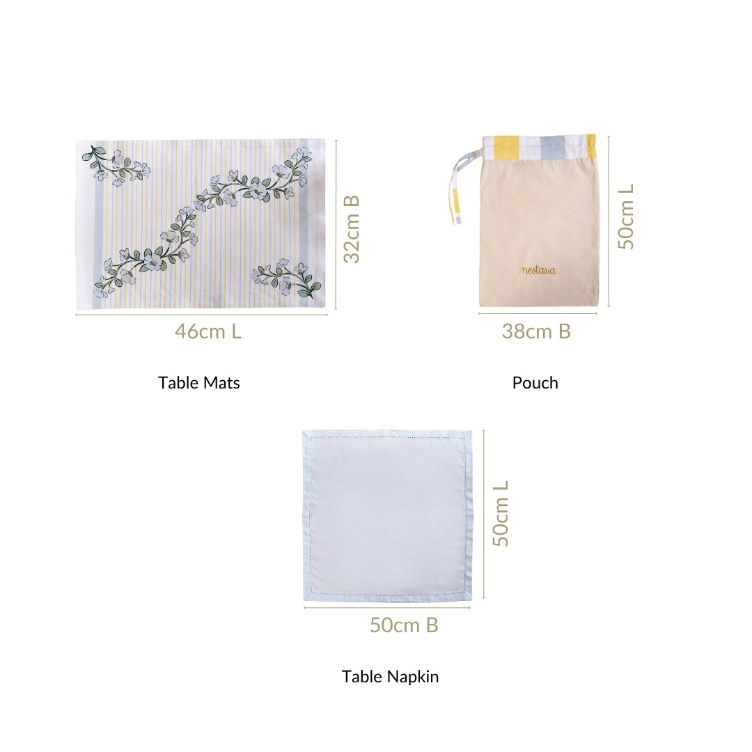 Design: Set against a crisp white backdrop, soft blue and yellow stripes weave through the fabric, creating a harmonious blend of colour and elegance. Delicate blue florals, accompanied by lush green stems and deep green highlights, bring a refreshing natural touch to the design. The linen table cloth drapes gracefully, while the matching table cover, placemats, and napkins complete the look with seamless coordination. Each piece is designed to strike the perfect balance between subtle sophistication and bold character, making this set a statement piece for both everyday dining and grand celebrations.