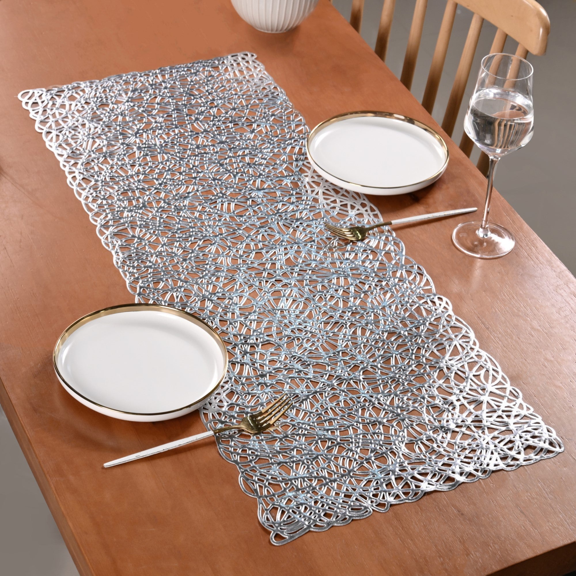 Design: Crafted for those who appreciate contemporary allure, this runner adds an eye-catching yet refined touch to everyday or festive tablescapes. Its standout feature is an intricate design, resembling a beautifully woven tapestry of abstract, interconnected loops and organic shapes. The continuous, interwoven pattern gives it a unique, unconventional edge, with fine line detailing that enhances its metallic sheen and visual depth.