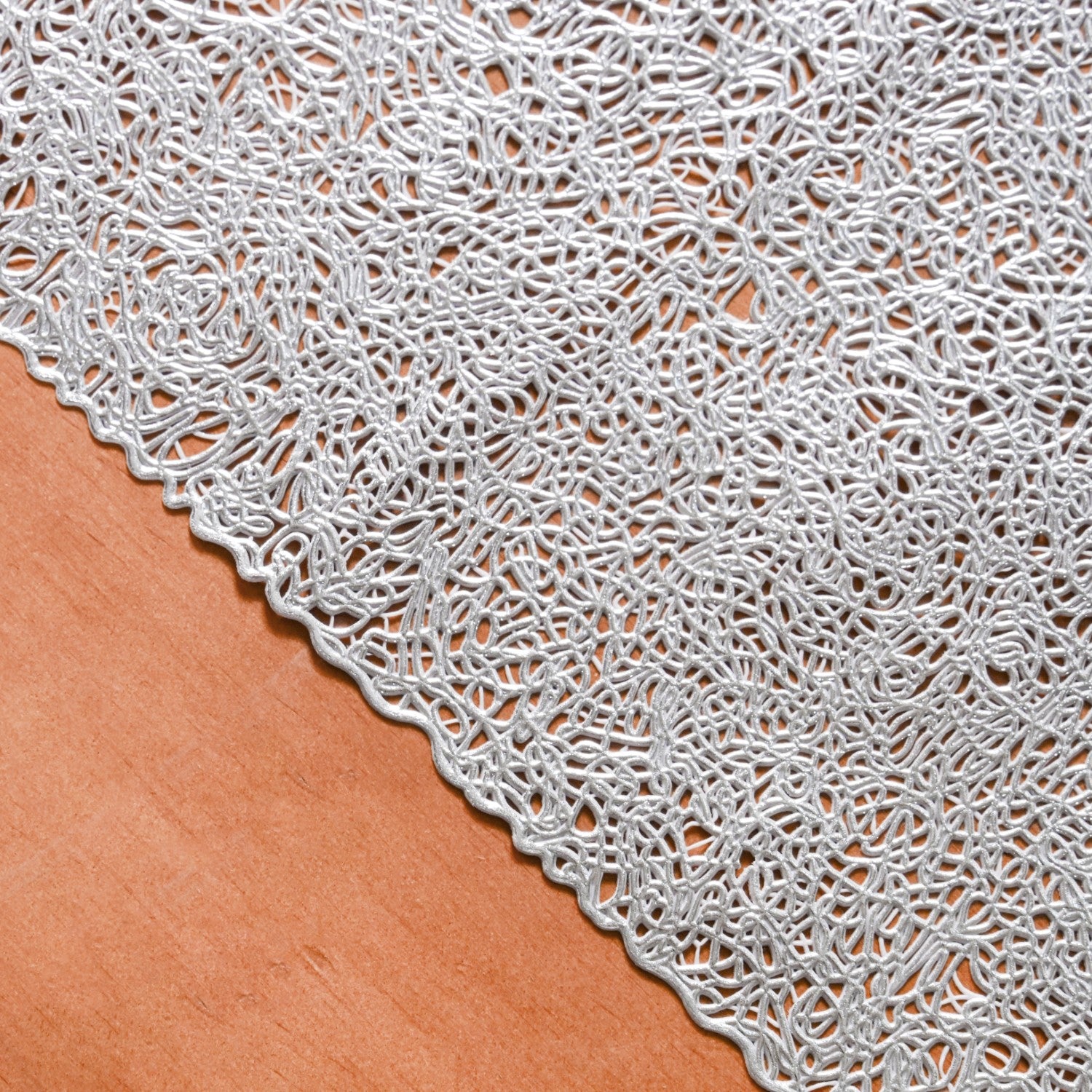 Design: This pretty table runner features a sleek rectangular shape that fits perfectly along most dining tables, adding a refined touch to any setting. Designed in a sophisticated silver tone, the runner showcases intricate ferrofluid patterns made of PVC material, lending it a subtle sheen and a modern, polished look. What sets this runner apart is its wavy pattern, which adds a soft, decorative detail to its structured form. Whether used for everyday dining or special occasions, this runner effortlessly blends style with functionality, making it a versatile addition to your table decor.