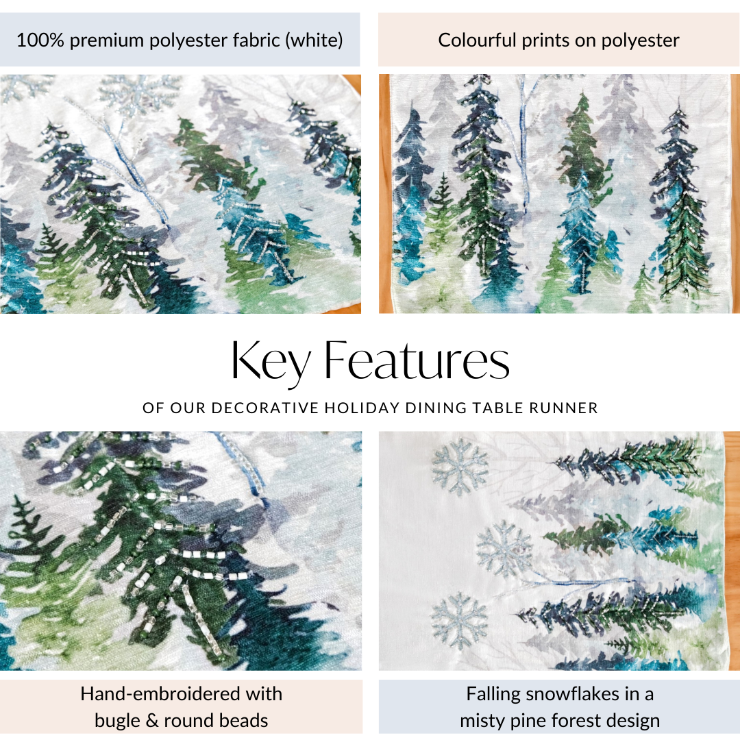 Design: The table runner showcases a serene scene of falling snowflakes amidst a misty pine forest, making it an ideal centrepiece for your holiday table. Its colourful prints are enhanced with exquisite hand-embroidered accents, featuring bugles and round beads that add a hint of sparkle to your Christmas decorations. The timeless white backdrop complements any dining table decor, creating a warm and festive ambience.