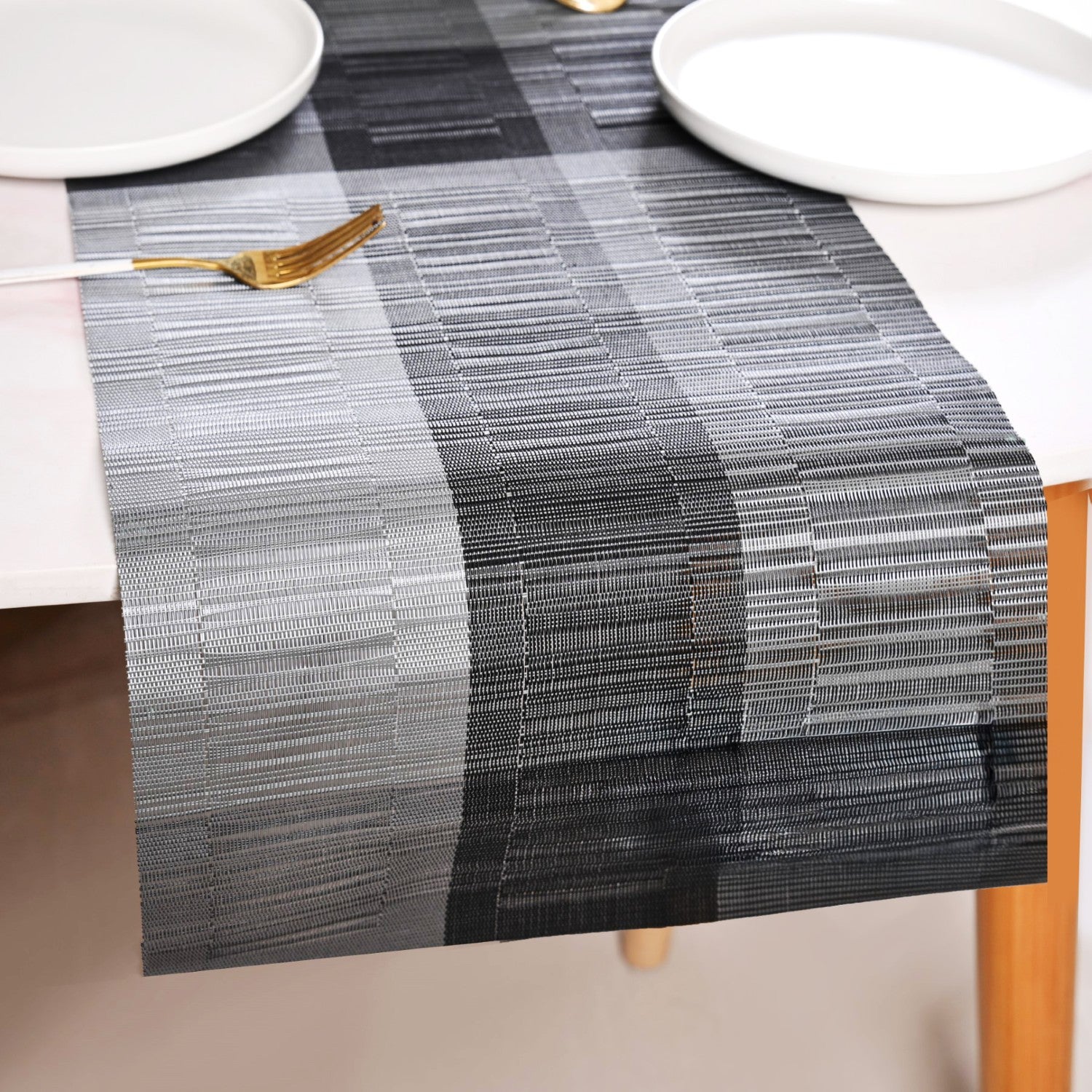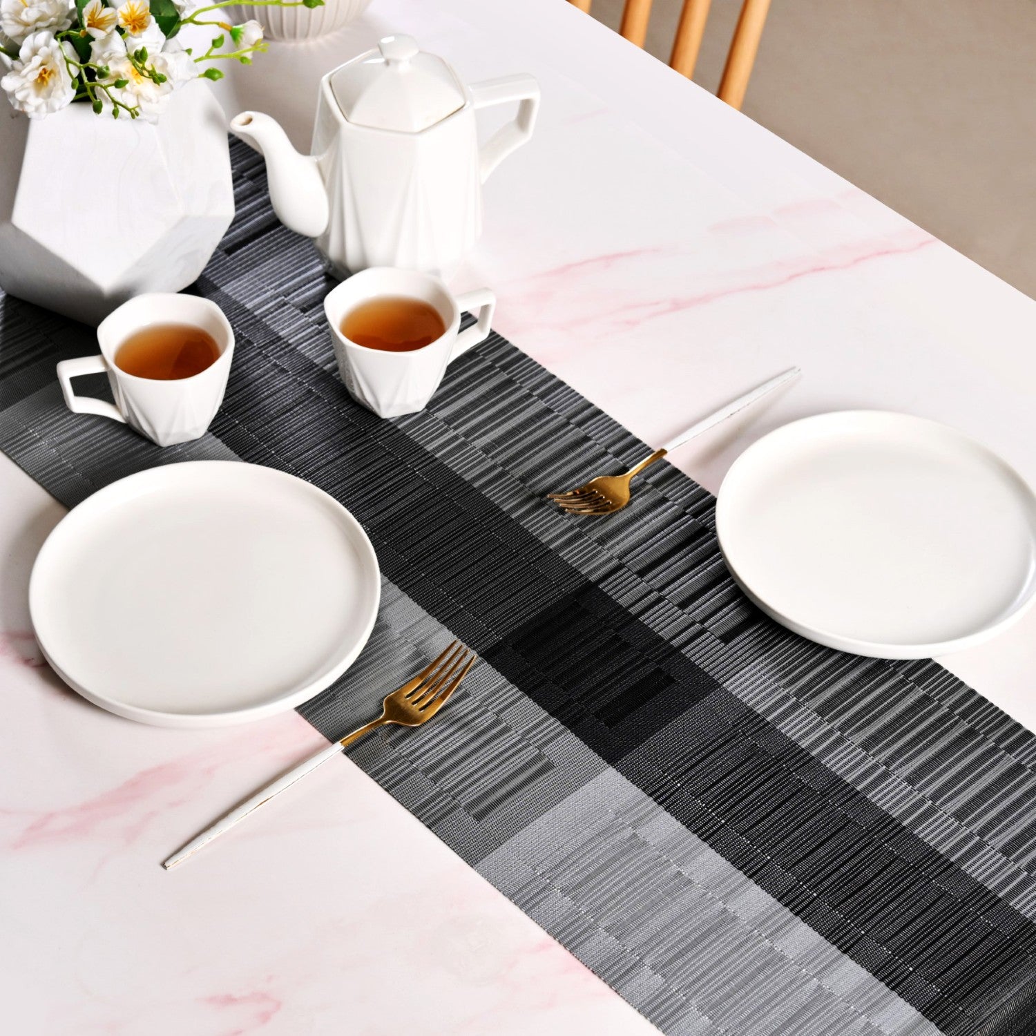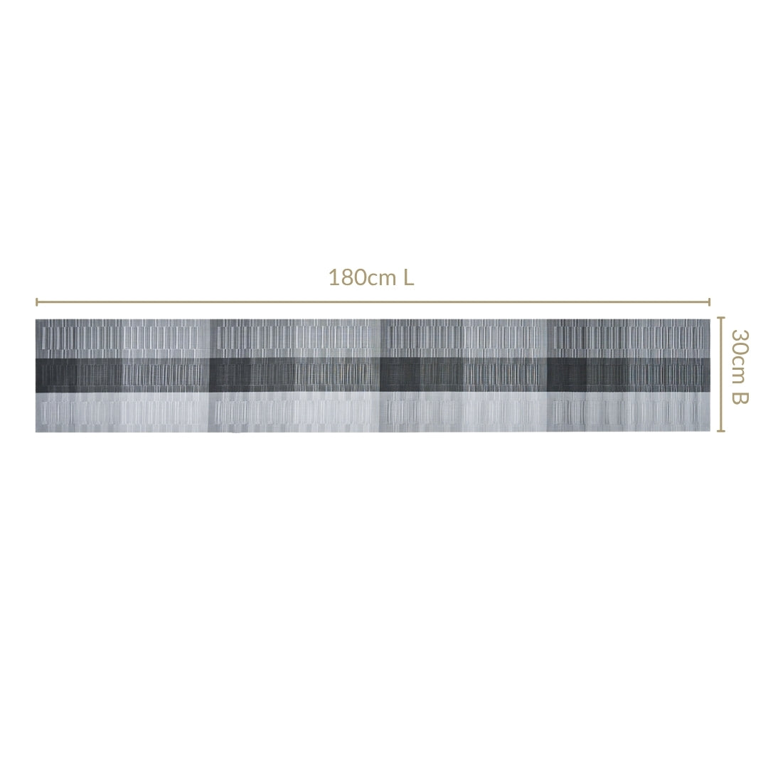 Design: This versatile table runner showcases a striking woven stripe pattern in contrasting shades of light grey, dark grey and black, creating a contemporary and versatile look. The intricate weave forms a captivating linear design, adding a rich visual texture. What makes it even more appealing is its reversible nature, allowing you to choose between two slightly different yet equally elegant arrangements of the striped pattern to match your mood or occasion. Its elegant design makes it suitable for both everyday use and special occasions, seamlessly blending with various interior styles.