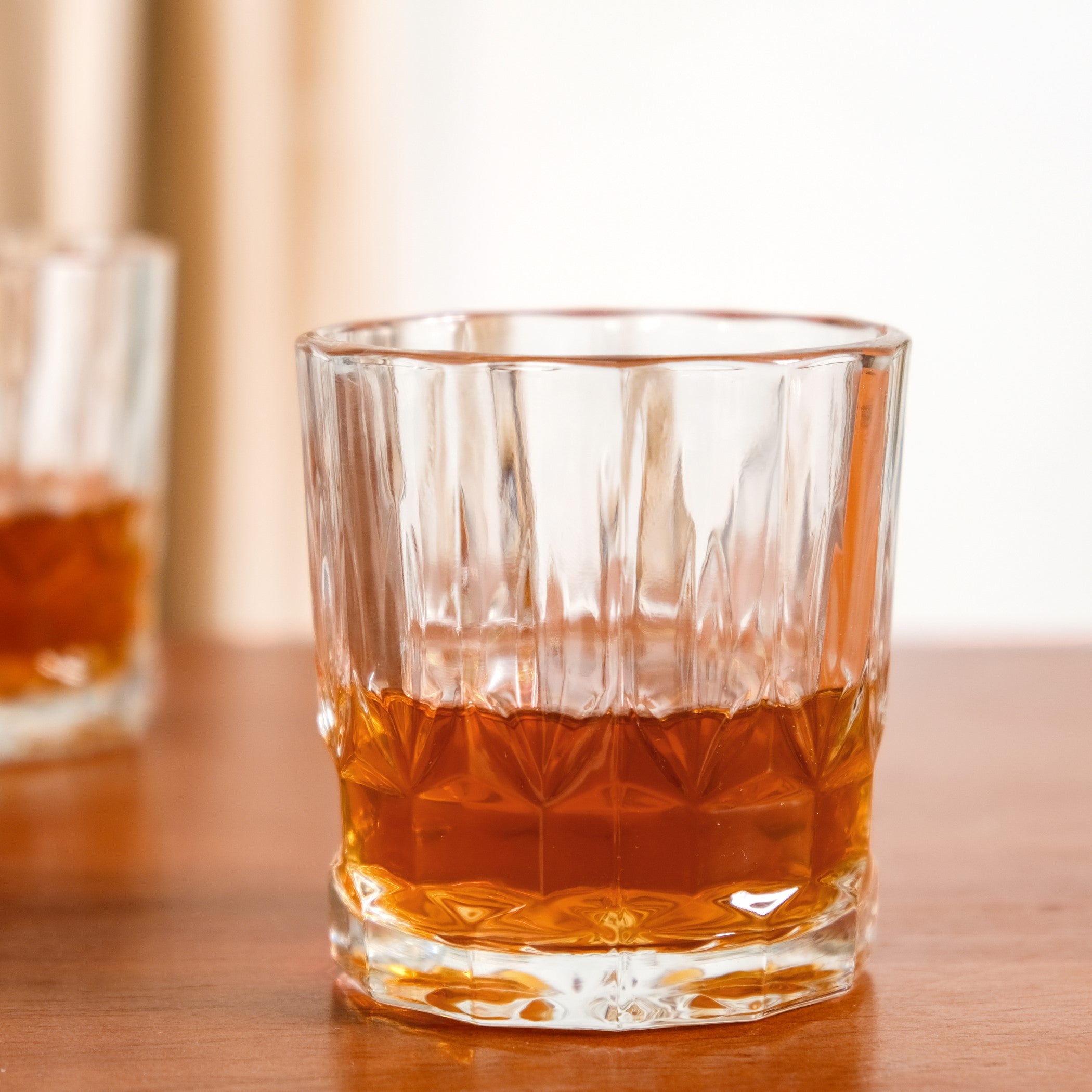 Design: Each of these stunning drinking glasses boasts a sleek, modern embossed design that feels both sophisticated and inviting. The crystal-clear transparency beautifully showcases the deep amber hues of your favourite whiskey, while the unique geometric patterns, meticulously embossed into the glass, add a layer of sophistication. But here’s the clever part: the indent around the base of the glass provides a subtle grip, letting your fingers nestle in comfortably. With a heavy base, these glasses have that solid, luxurious feel you’ll appreciate every time you raise a whiskey tumbler glass to take a sip.