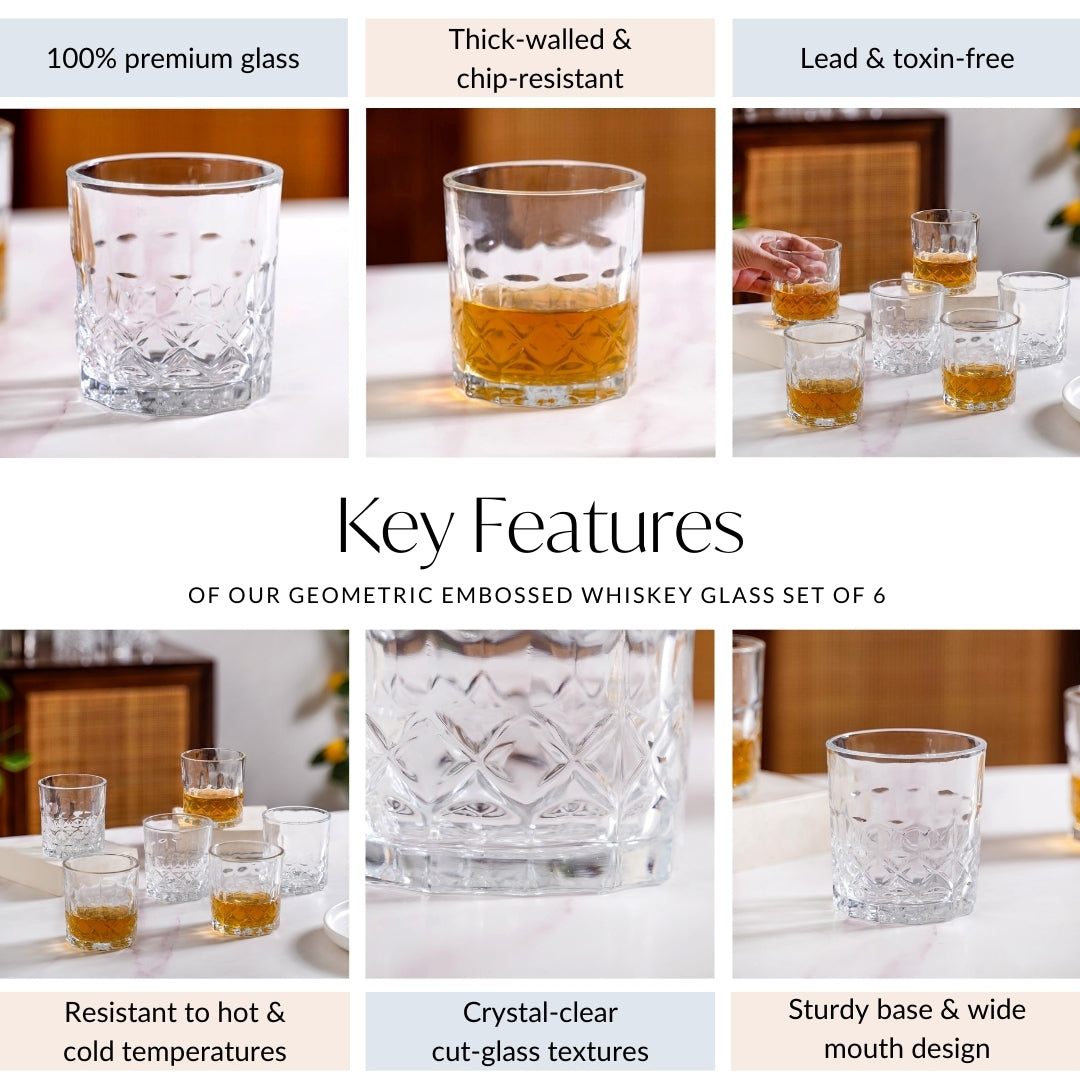 Benefits: Made from the highest quality glass, these whiskey glasses offer a myriad of benefits that make them a must-have addition to your drinkware collection. With a thick wall design and smooth, non-porous surface, these scotch glasses are less susceptible to chipping and cracking nor will they absorb any lingering flavours and odours. Moreover, glass is known for being chemically non-reactive to alcohol, preserving the flavour profile of all your cocktails and spirits. These qualities combined make maintaining these whiskey glasses' pristine condition as easy as it gets, ensuring they last for years to come.