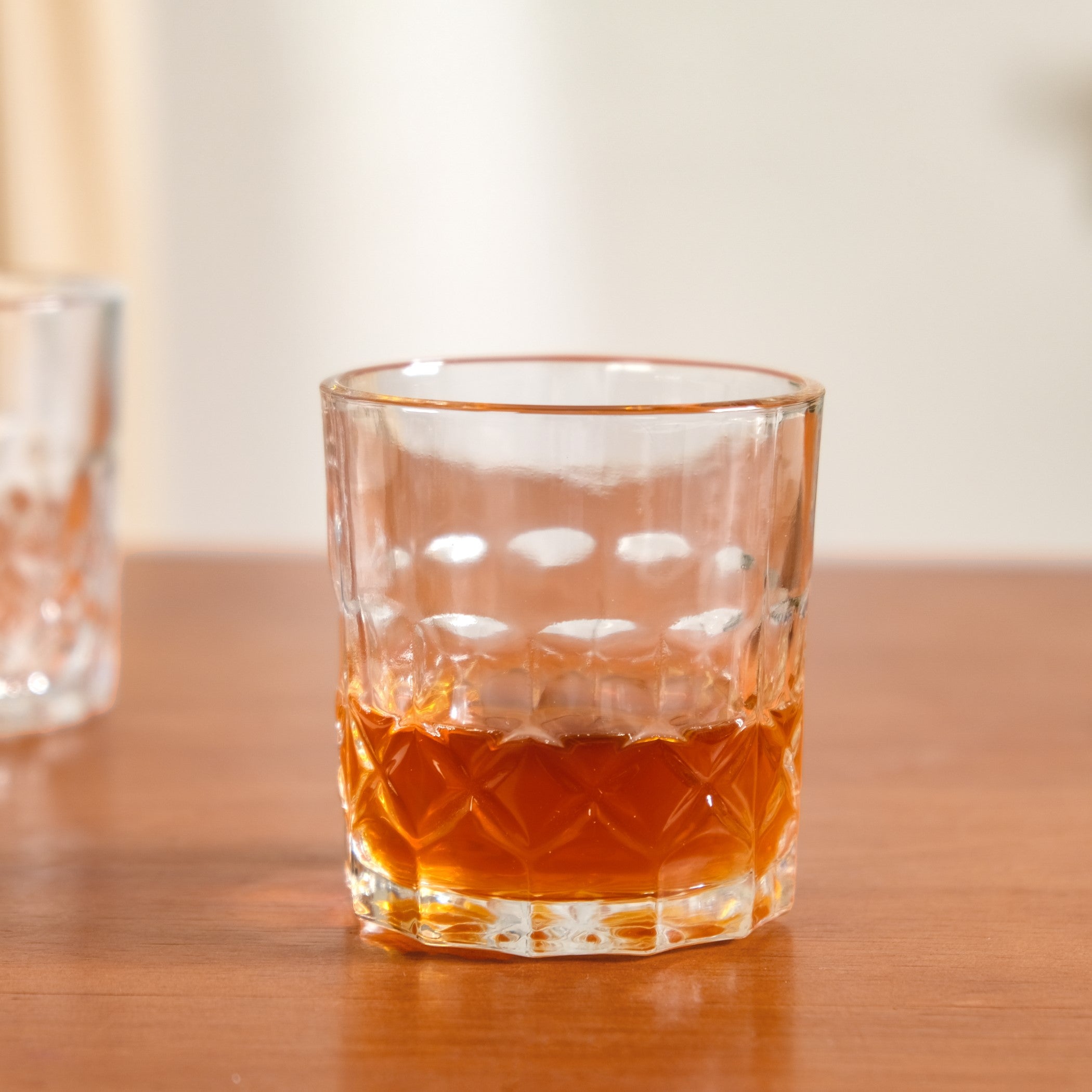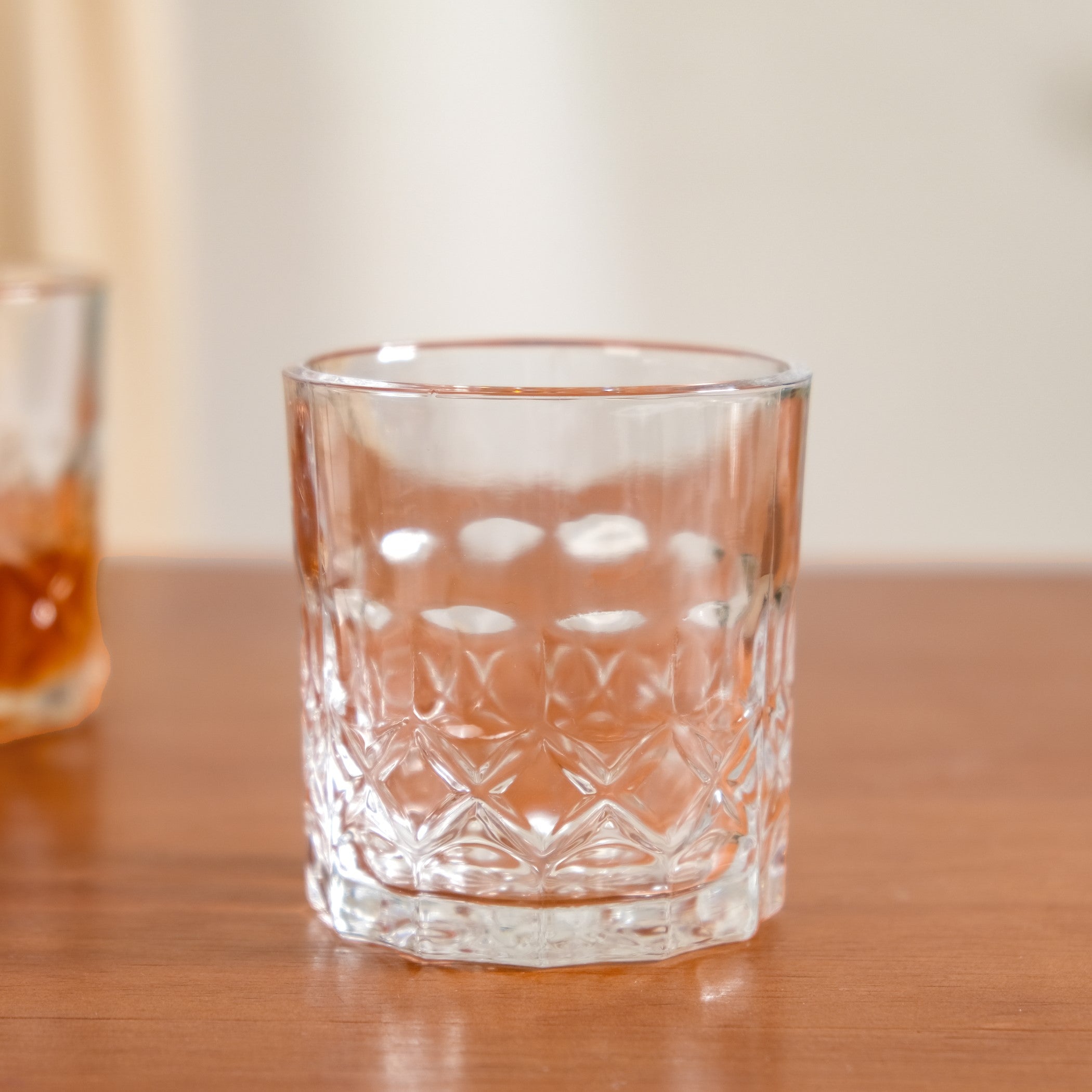 Design: Crafted to perfection, these whiskey glasses feature a modern cut design that adds a sleek, artistic touch to your drinkware. Their transparent clarity showcases the rich colour of your favourite spirits, only enhancing their allure. Furthermore, the unique, ergonomic design is not only visually appealing but also practical, offering a sturdy foundation for your favourite old fashioned whiskey glasses or bourbon glass.