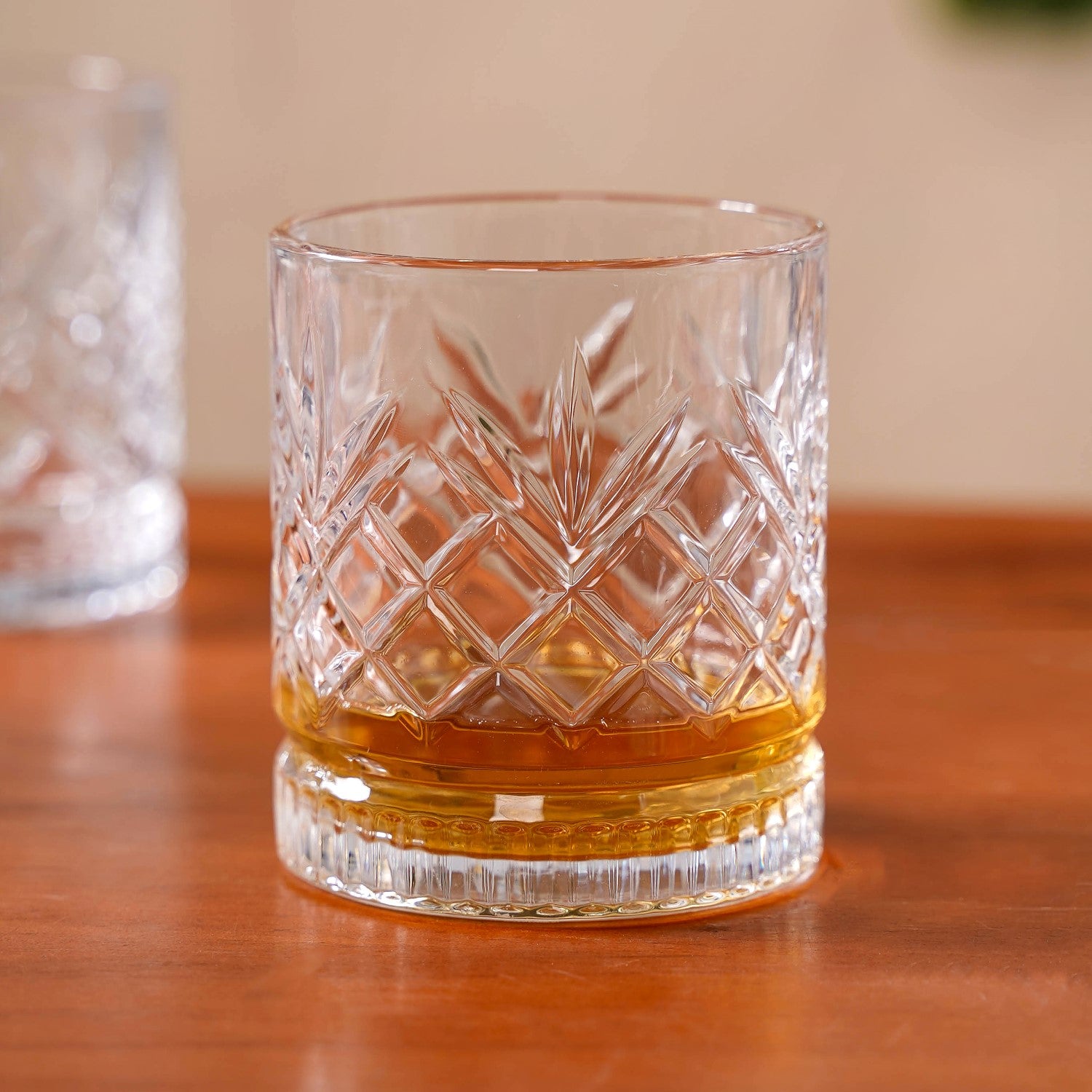Design: These glasses feature a meticulously crafted diamond and leaf-cut pattern, reminiscent of classic vintage glassware. The intricate details and patterns add a captivating sparkle to every pour. Moreover, the sturdy embossed base enhances stability while complementing the overall luxurious appeal.